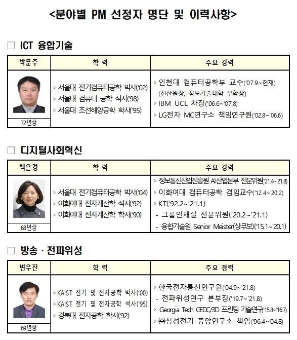 최종적으로는 ▲디지털사회혁신 PM에 정보통신산업진흥원 백은경 전문위원 ▲ICT융합 PM에 박문주 인천대 교수 ▲방송·전파위성 PM에 변우진 한국전자통신연구원(ETRI) 전파위성연구 본부장이 임명됐다.