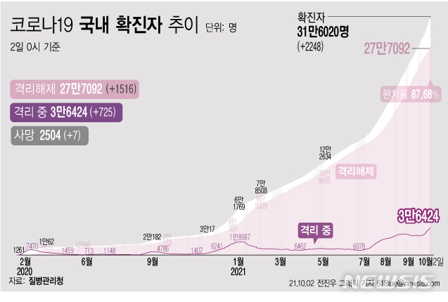 ![[서울=뉴시스] 2일 코로나19 예방접종대응추진단에 따르면 전날 2일 1차 접종자는 23만6268명 늘어 누적 3958만5265명이다. 전체 국민의 77.1%가 1차 접종을 마쳤다. 접종 완료자는 전체 인구의 51.8%인 2657만4685명이다. (그래픽=전진우 기자) 618tue@newsis.com](https://img1.newsis.com/2021/10/02/NISI20211002_0000839351_web.jpg?rnd=20211002110545)