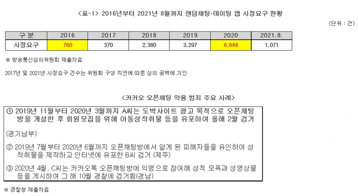 5일 김상희 국회부의장(과학기술정보방송통신위원회, 경기 부천병)이 방송통신심의위원회에서 제출받은 자료에 따르면 2016년 760건이던 랜덤채팅 앱 시정요구 건수는 2020년 6848건으로 5년 만에 9배 이상 증가한 것으로 나타났다.