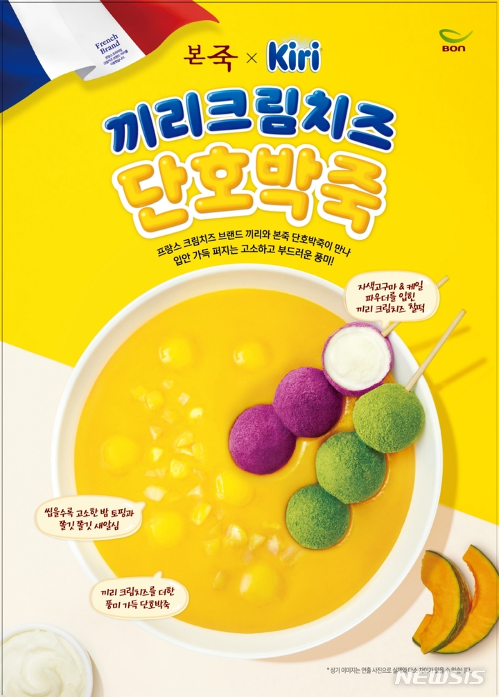 끼리 크림치즈 단호박죽은 프랑스 크림치즈 브랜드인 '끼리'와 협업해 본죽의 스테디 셀러 메뉴인 단호박죽에 풍미를 더한 이색 메뉴다. 단호박죽에 끼리 크림치즈 소스를 넣어 고소한 맛과 함께 꿀, 계피가루로 한식의 포인트를 살렸다.