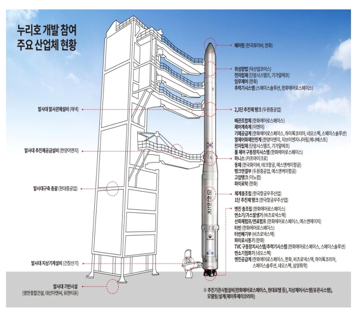 특히 한화에어로스페이스가 핵심인 엔진을 만들었고, 한국항공우주산업(KAI)와 두원중공업은 탱크와 동체 개발에 참여했다. 발사대는 현대중공업이 주축이 돼 독자적으로 구축했다.