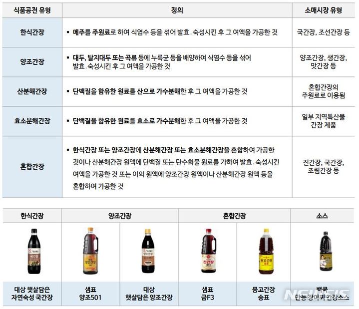 이때 제조 방법에 따라 간장의 종류가 나뉘게 된다. 가장 잘 알려진 양조간장은 대두 등 곡류에 누룩균을 배양해 발효, 숙성시킨 간장이고 산분해간장은 단백질 원료를 산으로 분해해 만드는 간장을 말한다.