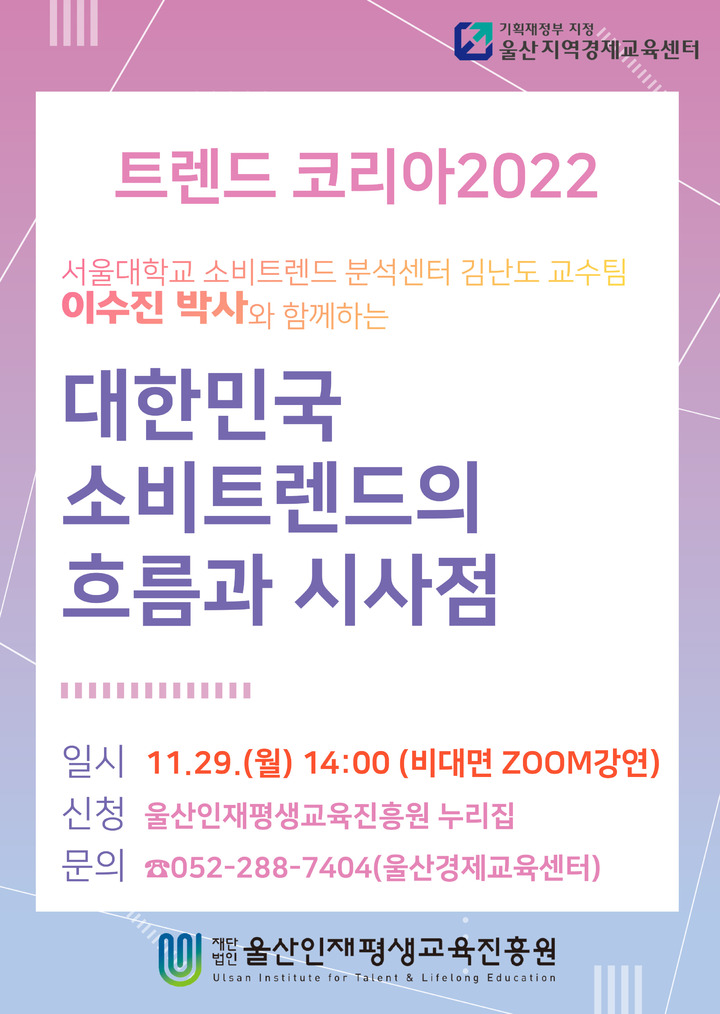 울산인재평생교육진흥원(원장 허황)은 29일 오후 2시 시민을 대상으로 비대면 ZOOM을 통해 '트렌드 코리아 2022' 시민경제교육 특강을 개최한다.