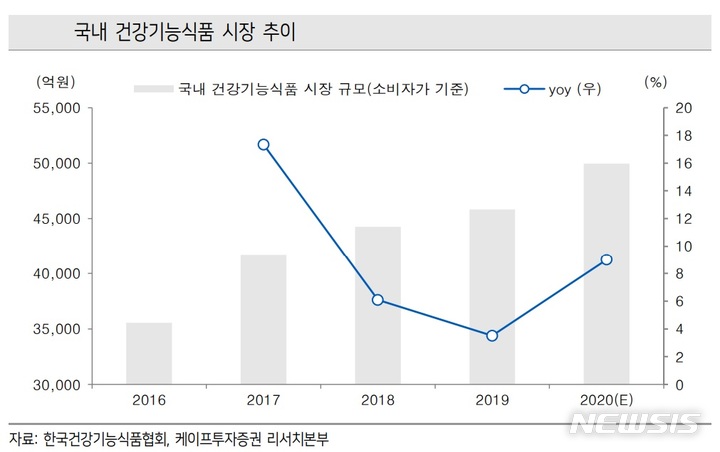 김혜미 케이프투자증권 연구원은 "건강기능식품 산업은 여전히 국내에서 두드러진 성장세를 시현하고 있으며 코로나19 사태로 이러한 추세는 해외로 확대되고 있는 중"이라며 "고성장 산업으로 부각됨에 따라 다양한 업체들이 활발하게 진출하고 있다"고 말했다.