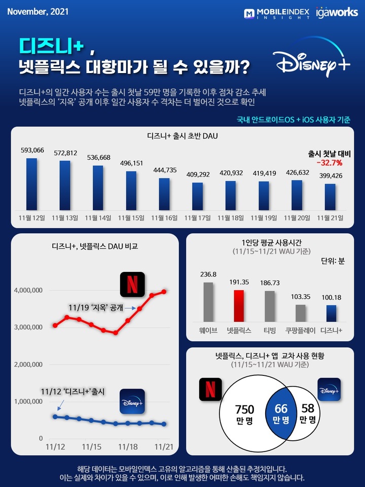 26일 빅데이터 분석업체 모바일인덱스에 따르면 디즈니+의 출시 첫날인 지난 12일 안드로이드와 iOS 기준 일사용자수(DAU)는 59만3066명으로 확인됐다. 이어 21일 DAU는 39만9426명으로, 출시일 대비 32.7% 감소했다.