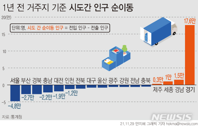 1년 전 거주지 기준으로 이동한 인구는 16.6%였으며 시군구 경계를 벗어난 이동률은 7.2%였다. 순유입 인구가 많은 지역은 경기(17만6000명)가 1위였으며 경남(1만5000명), 세종(1만명) 순이었다. 반면 서울에서는 4만8000명이 빠져나가며 전국에서 순유출 규모가 가장 컸다. 부산(-2만7000명), 경북(-2만7000명)도 순유출됐다.