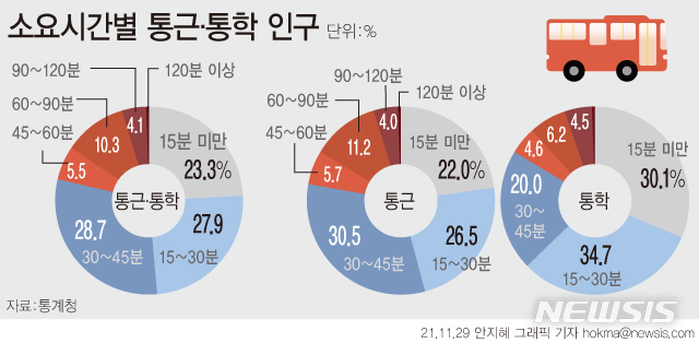 통근·통학인구의 통근·통학 소요 시간을 보면 30분 미만이 51.2%로 가장 많았으며 30~60분(34.3%), 60~120분(14.4%) 순으로 나타났다. 평균 통근·통학 시간은 30분으로 2015년(30.9분)보다 0.9분 감소했다. 평균 통근 시간은 30.8분이었으며 통학 시간은 26.2분이었다.