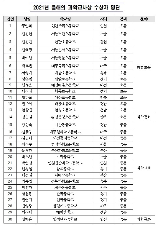 지난 7월 시상계획 공고를 시작으로 분과심사(9월), 공적 공개검증(10월), 종합심사(11월)를 거쳐 우수 과학교사 30명(과학교육 분야 28명, 과학문화 분야 2명)을 최종 선정했다.