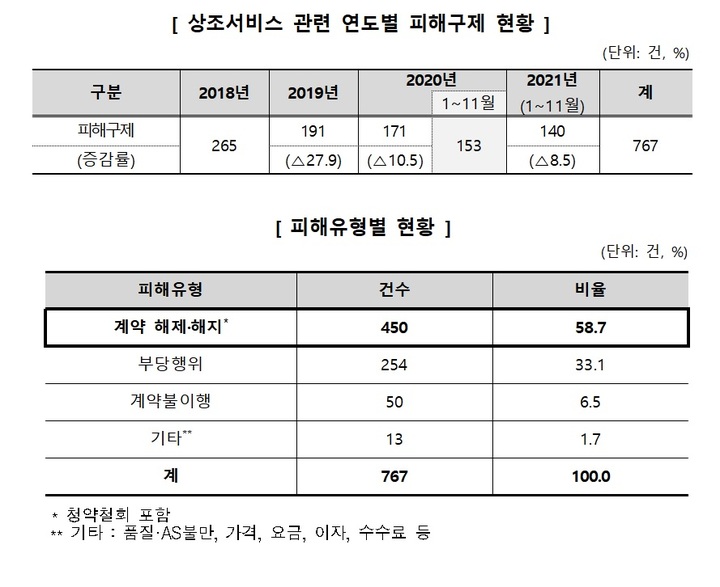소비자원에 따르면 지난 2018년부터 올해 11월까지 접수된 상조서비스 관련 피해 구제 신청은 767건으로 집계됐다. 피해 유형별로는 청약 철회 또는 환급 거부, 환급금 과소지급 등 계약해제 관련 피해가 58.7%로 가장 많았고, 이어 부당행위 33.1%, 계약 불이행 6.5% 순으로 나타났다.