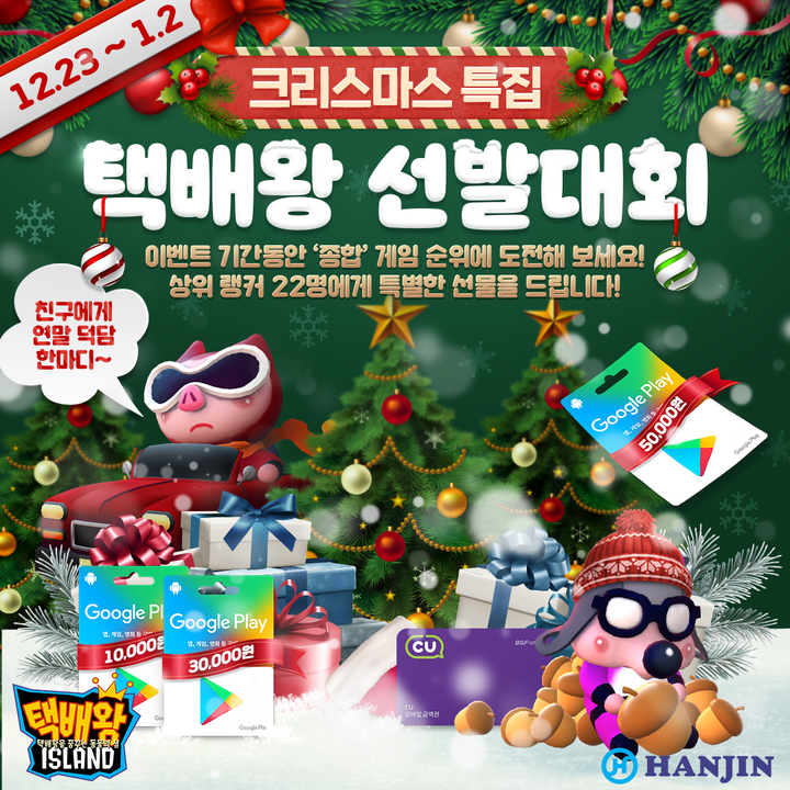 이번 이벤트는 ‘택배왕 아일랜드’에 찾아온 연말 성수기 택배 대란을 해결할 최고의 택배왕을 선발하는 내용이다. 이벤트 기간 중 분류, 상차, 배송게임 3종을 모두 플레이하고 종합 점수 상위 유저 총 22명에게 구글플레이 기프트카드를 증정한다.