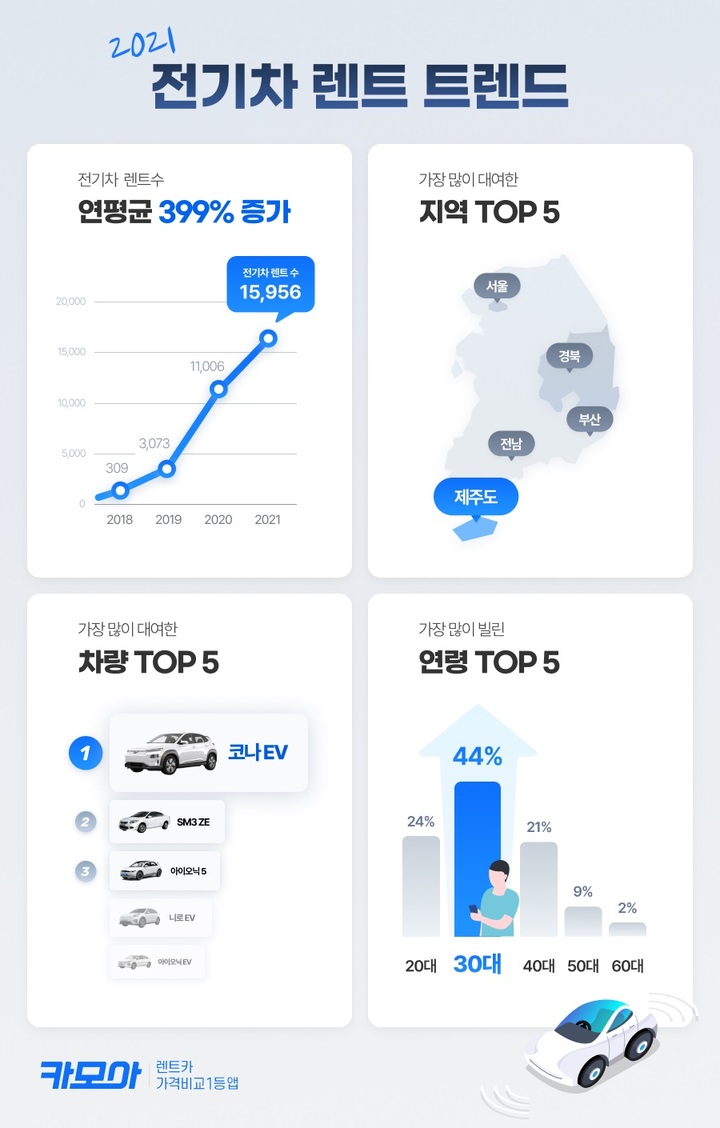 렌트카 가격 비교앱 '카모아'가 자사 플랫폼 예약 데이터를 기반으로 집계, 27일 발표한 '2021년 전기차 렌트 트렌드'에 따르면 카모아가 서비스를 시작한 2018년부터 전기차 렌트가는 연평균 399% 이상 증가하고 있다.