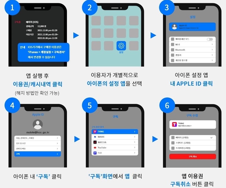 방송통신위원회는 애플 앱마켓 및 주요 구독서비스를 제공하는 모바일 앱의 인앱결제 해지절차를 점검하고 앱내 해지기능을 마련하도록 개선 권고했으며, 애플 및 앱 개발사들은 이를 자진 시정하겠다고 5일 밝혔다.