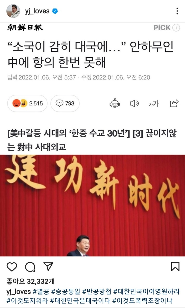 또 포털사이트 네이버에 '반공방첩'을 검색하면 음식점이 뜨는 사진을 올렸고, 작년에 두 차례 통신 조회를 당했다는 '통신자료 제공내역서 확인서'를 캡처해 게시했다. 이어 북한의 탄도미사일 발사 관련 기사와 김정은의 사진을 게시하며 "내 멸공은 중국보다는 우리 위에 사는 애들을 향한 멸공이다", "나의 멸공은 중국과는 아무런 상관이 없다" 등의 글을 첨부했다.
