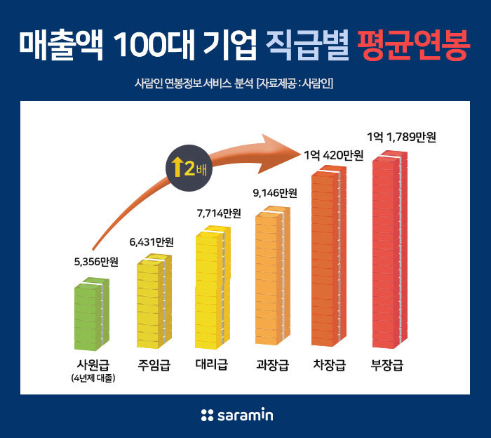 사람인에 따르면 100대 기업 대졸 사원은 연봉은 이후 승진할 때마다 ▲주임급 6431만원 ▲대리급 7714만원 ▲과장급 9146만원 ▲차장급 1억420만원 순으로 차장급에서 약 2배가 된다. 이어 부장급은 1억1789만원으로, 사원에서 부장까지 승진 시 연봉은 119.9%가 상승했다.