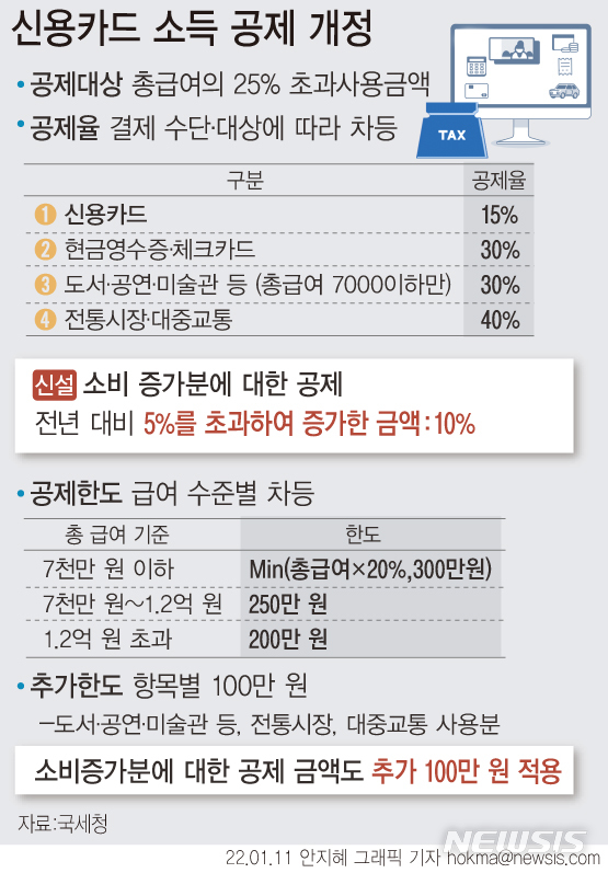 현행 세법상 ▲도서 구매, 공연·미술관 관람 등 사용분 ▲전통 시장 사용분 ▲대중교통 사용분에 각각 100만원씩 추가로 소득에서 빼주고 있는데, 여기에 2020→2021년 소비 증가분에 대한 공제를 100만원 추가하기로 한 것이다.