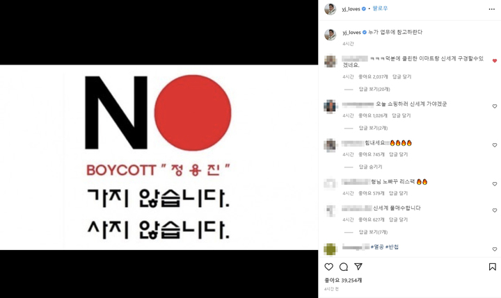 정 부회장은 지난 11일 'NO, 보이콧 정용진, 가지 않습니다. 사지 않습니다'라고 적힌 신세계 불매운동 이미지를 자신의 인스타그램에 올리며 "누가 업무에 참고하란다"라고 적었다.