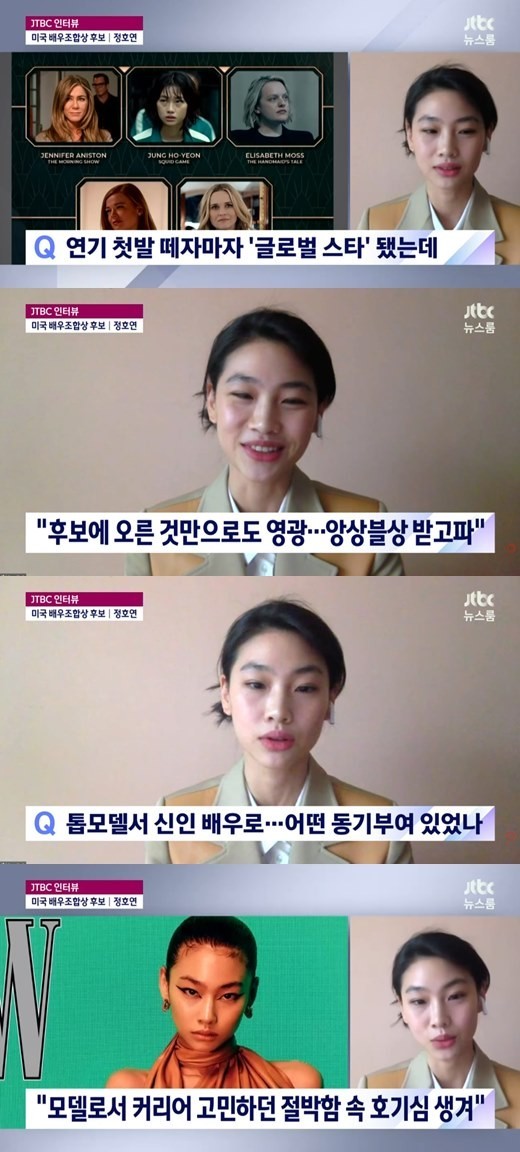 넷플릭스 시리즈 '오징어 게임'으로 글로벌 스타가 된 배우 정호연(28)은 이 작품을 통해 연기자로 데뷔했다. 그는 종합편성채널 JTBC '뉴스룸'에 출연해 2010년부터 모델로 활동하다가 배우가 된 과정에 대해 이렇게 말했다. 그는 파리에서 일정을 소화한 뒤 귀국해 현재 자가격리 중이어서 온라인 화상 인터뷰 형식으로 출연했다.