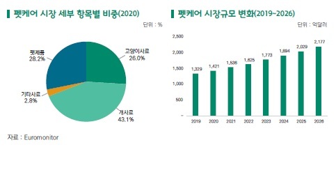 19일 한국무역협회 국제무역통상연구원이 발간한 '성장하는 펫케어 산업 최신 트렌드와 우리 기업의 글로벌 경쟁력 강화방안'에 따르면 팬데믹으로 인한 소비심리 위축에도 불구하고 2020년 세계 펫케어 시장은 전년대비 6.9% 증가한 1421억 달러를 기록했다. 또 2026년까지 2177억 달러 규모로 성장할 전망이다.