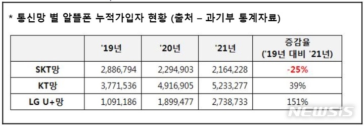 그랬던 SK텔레콤이 10년이 흐른 현재 정치권의 알뜰폰 사업 철수 요구에 전향적인 입장을 보인다. 실제로 SK텔레콤은 최근 알뜰폰 영업에 소극적이다. SK텔레콤 망 알뜰폰 누적 가입자 수는 2021년 기준 216만4228명으로 타 이통사 대비 가장 적다. 특히 증감률은 2019년 대비 -25%로, 타사의 행보와 상반된다. KT는 39%, LG유플러스는 151% 증가했다.