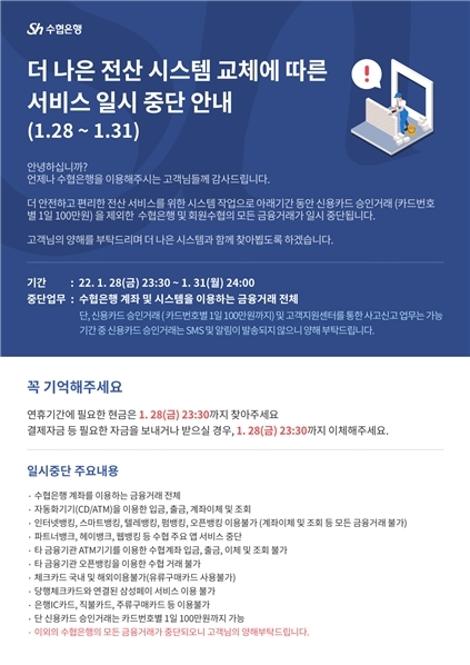 수협은행 관계자는 "전산 시스템 노후화에 따른 정보기술(IT)인프라 전면 교체, 고도화 작업으로 고객들께 불편을 드리게 된 점 많은 양해 부탁드린다"며 "현금 입출금이나 결제자금 이체 등 금융거래가 필요한 고객들께서는 반드시 이전까지 마무리해주길 바란다"고 말했다.
