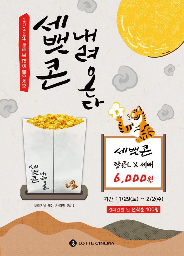 [서울=뉴시스] 손정빈 기자 = 롯데시네마는 오는 29일부터 다음 달 2일까지 기존 가격으로 3배 용량의 팝콘을 즐길 수 있는 '세뱃콘' 행사를 연다.