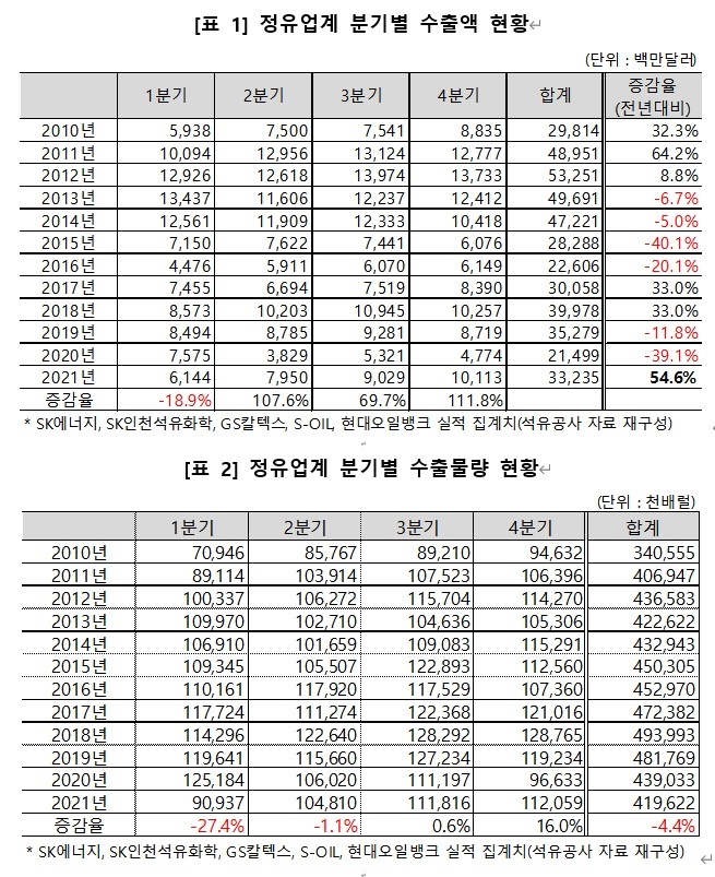 대한석유협회(KPA)는 지난 2021년 SK에너지, GS칼텍스, S-OIL, 현대오일뱅크 등 국내 정유사의 석유제품 수출액이 332억 3534만 달러로 집계됐다고 27일 밝혔다. 수출액 증가율은 전년대비 54.6%로 10년 전인 2011년(64.2%) 이후 최대폭이다.