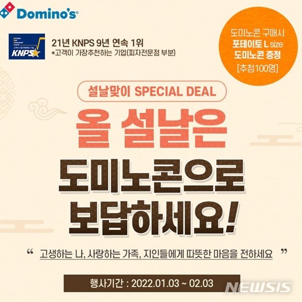 도미노피자는 다가오는 설날을 맞아 모바일 상품권(도미노콘)을 선보였다. 다음달 3일까지 모든 온라인 고객을 대상으로 도미노콘 20% 할인 이벤트를 진행한다.