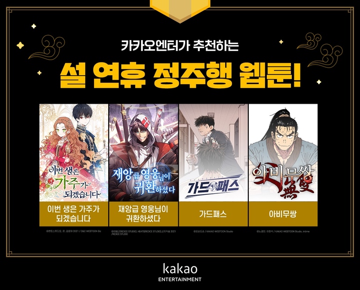 카카오엔터테인먼트 관계자는 "이제는 영화나 방송뿐 아니라 웹툰 역시 정주행하면서 집중적으로 즐기기에 좋은 콘텐츠로 자리잡고 있다"며 "특히 올해 설에도 코로나로 대다수 가족들이 집에 머물 것으로 예상돼 무료함을 달웹툰 라인업을 준비했다"고 말했다.