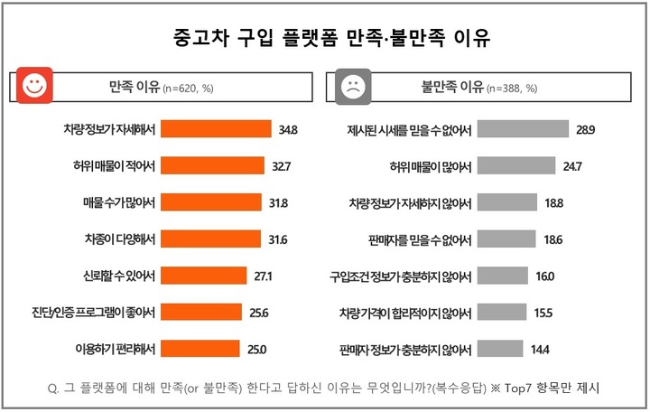 이에 따르면 중고차 플랫폼에 대한 평균 만족률은 구입할 때 36.6%, 처분할 때 34.9%로, 신차(54.6%)의 3분의 2에 그쳤다. 이는소비자 불신의 영향이 크다는 것이 컨슈머인사이트의 설명이다.