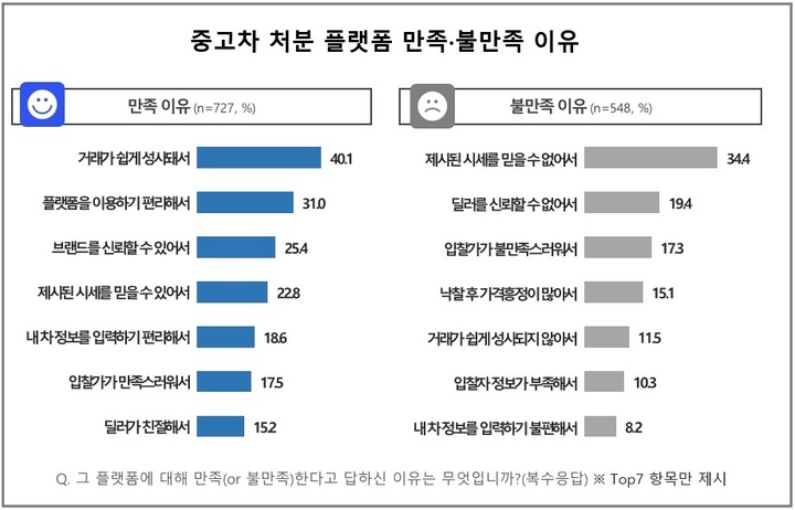 소비자들은 중고차 플랫폼에 대한 불만 요인으로 ▲제시된 시세를 믿을 수 없다 ▲허위매물이 많다 ▲입찰된 시세를 믿을 수 없다 ▲딜러를 신뢰할 수 없다 등 '신뢰' 관련 요소를 꼽았다.