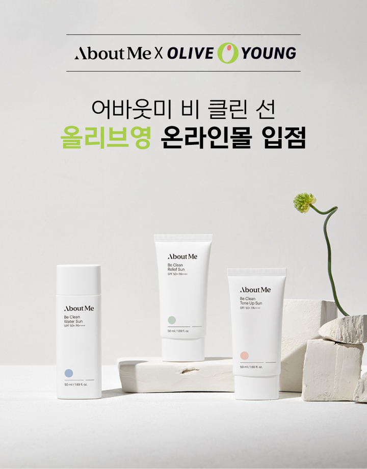 어바웃미 비 클린 선라인 3종은 내추럴하게 피부 톤을 보정해주는 '톤업 선', 민감 피부를 위한 '릴리프 선', 쿨링과 수분 공급을 위한 '워터 선' 등 3종으로 구성된 자외선 차단제다.