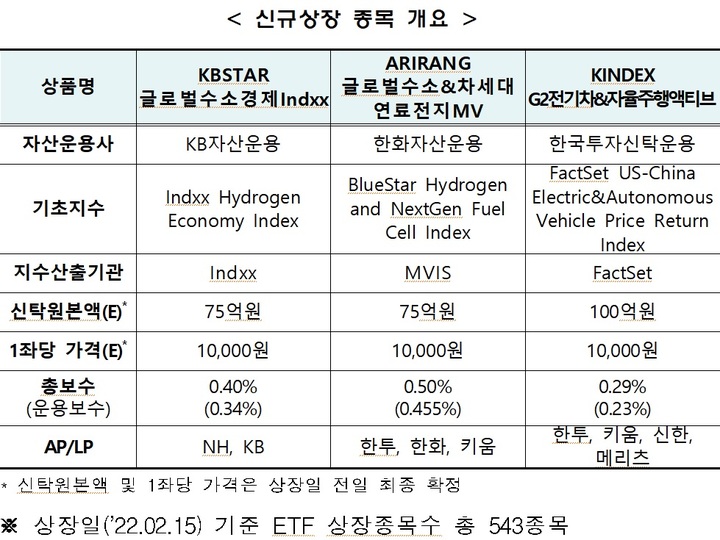 거래소에 따르면 신규 상장 3종목은 ▲KB자산운용의 'KBSTAR 글로벌수소경제Indxx' ▲한화자산운용의 'ARIRANG 글로벌수소&차세대연료전지MV' ▲한국투자신탁운용의 'KINDEX G2전기차&자율주행액티브' ETF다.