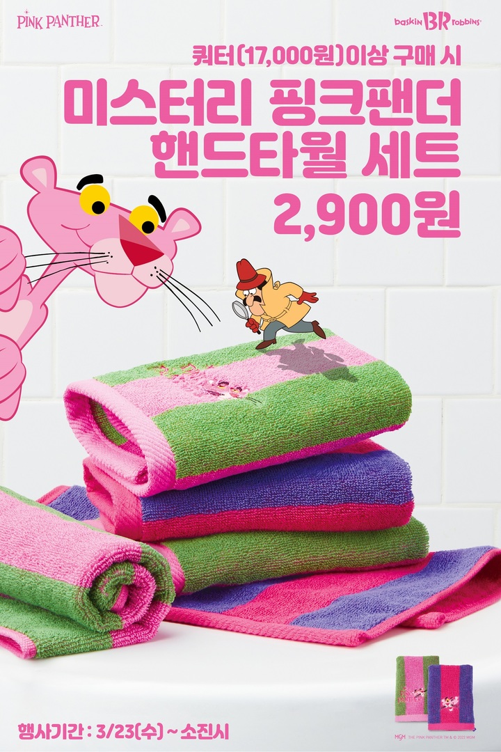 [서울=뉴시스]김혜경 기자 = ▲배스킨라빈스가 인기 캐릭터 브랜드 '핑크팬더'와 협업해 '미스터리 핑크팬더 핸드타월 세트'를 출시한다. 이 타월 세트는 핑크팬더 얼굴이 새겨졌으며 분홍색, 초록색 등 다채로운 색상의 스트라이프 패턴 2종으로 구성됐다. 오는 23일부터 오프라인 매장에서 아이스크림 쿼터(1만7000원) 사이즈 이상 구매 시 '미스터리 핑크 핸드타월 세트'를 2900원에 만나볼 수 있다.