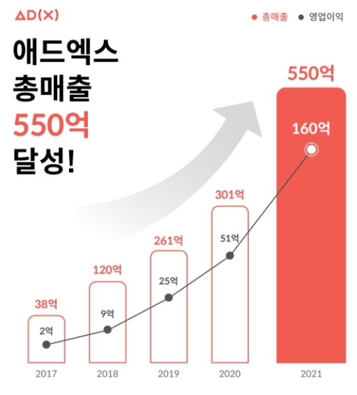 애드엑스는 설립 이듬해인 2017년부터 38억원의 매출이 발생하며 매년 평균 95%에 육박하는 연평균성장률(CAGR)을 기록해 왔다. 지난해에는 전년대비 250억원 이상의 매출이 증가했다.
