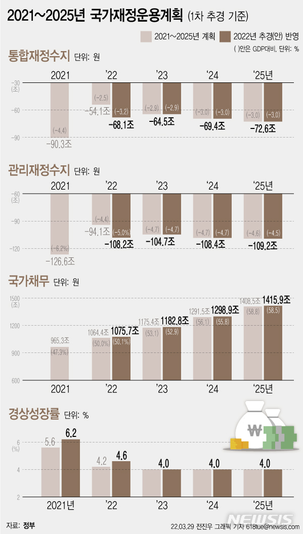 나라살림 상태를 보여주는 통합재정수지(총수입-총지출)는 70조원에 가까운 적자를 기록 중이다. 재원 마련 방법에 따라 이 규모 역시 더 커질 수 있다.