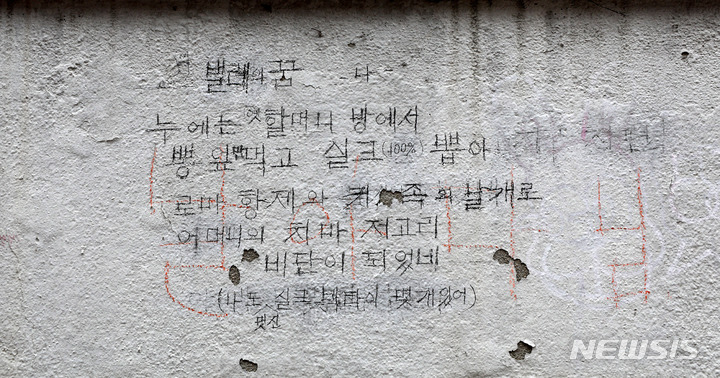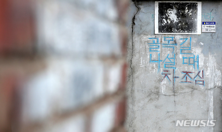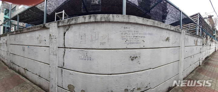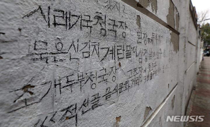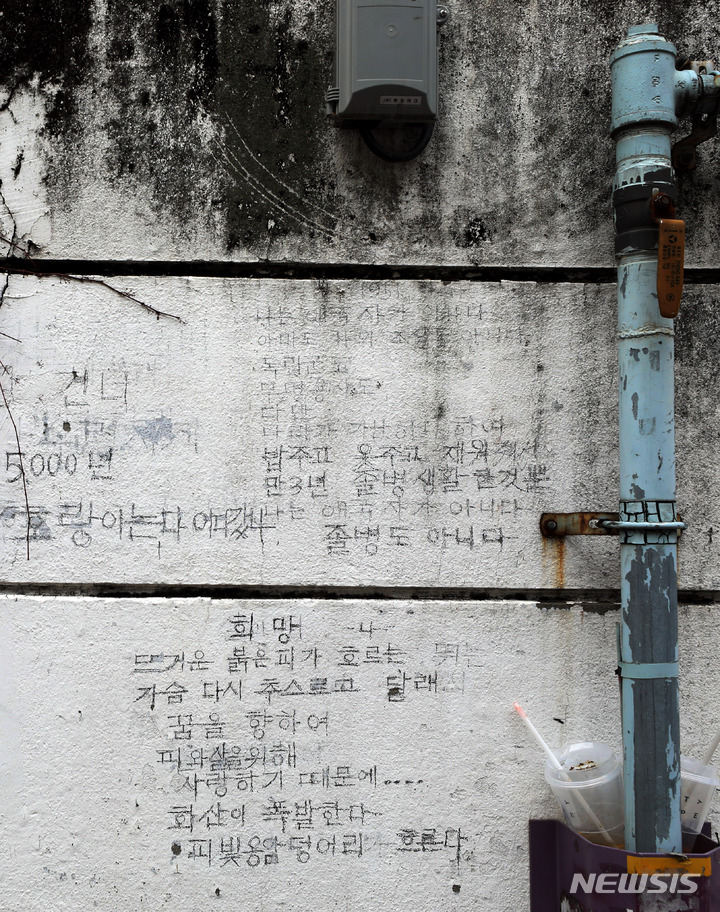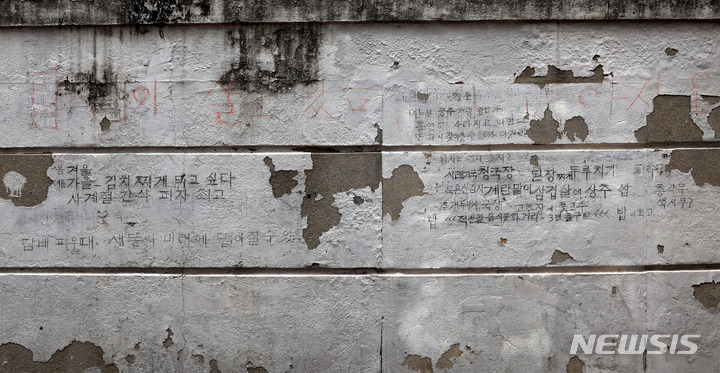 골목 입구 페인트가 벗겨진 벽을 따라 이어진 낙서. 누군가 써 놓은 글귀가 보인다.