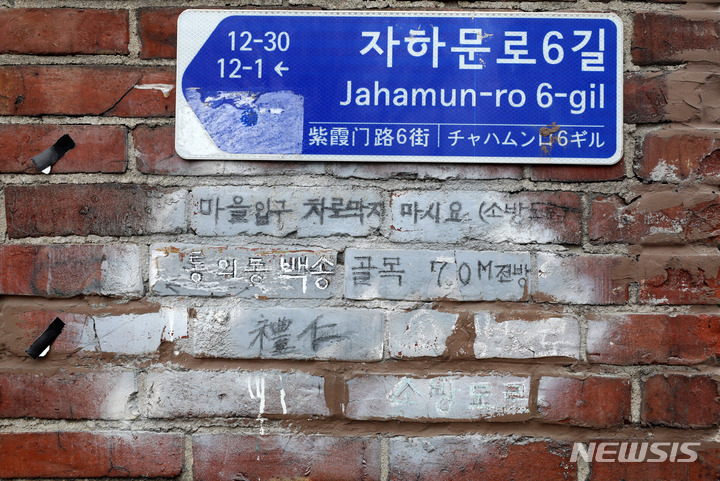 도로명 주소가 적혀 있는 벽 밑에 '마을입구 차로막지 마시요'라고 쓰여 있다.