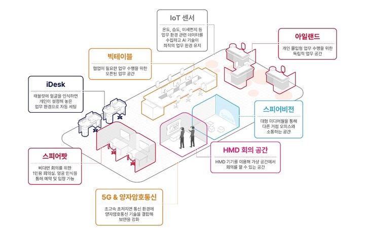 또한 스피어 곳곳에 위치한 IoT 센서가 온도, 습도, 미세먼지, 유해물질, CO2, 조도, 소음 등 업무 환경 관련 데이터를 수집하고 이를 기반으로 AI(인공지능) 기술이 최적의 업무 환경을 유지한다.