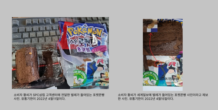 황 씨는 해당 포켓몬빵에서 길이 1㎝가량의 애벌레를 발견했고, 이튿날인 11일 제조사 고객센터에 연락해 경위를 조사해 달라고 요청했다. 이 애벌레는 밤바구미 유충으로 확인됐다.