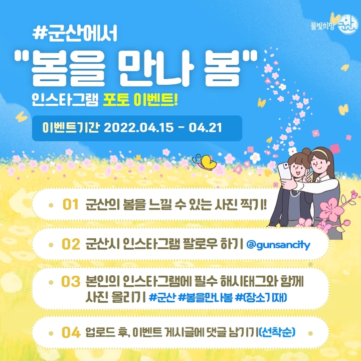 ▲군산시 인스타그램(@gunsancity)을 팔로우한다 ▲군산의 봄을 느낄 수 있는 사진을 찍는다 ▲본인의 인스타그램에 필수 해시태그 ‘#군산 #봄을만나봄 #(장소기재)’와 함께 사진을 올린다 ▲이벤트 게시글에 댓글을 남긴다 순으로 진행하면 된다.