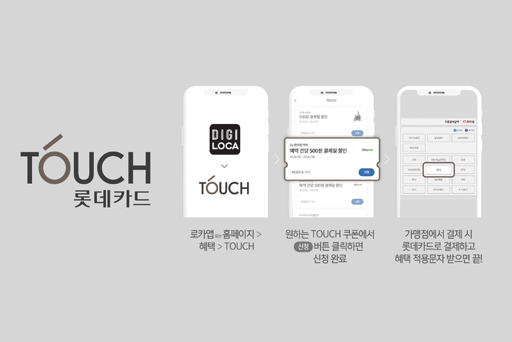 롯데카드의 'TOUCH' 서비스는 고객의 성향 및 소비 패턴, 선호 가맹점 등을 분석해 고객이 필요로 하는 혜택을 자동으로 추천해주는 서비스다. 고객은 롯데카드 디지로카앱이나 홈페이지 TOUCH 서비스에서 마음에 드는 혜택을 터치완료 후 결제하면 자동으로 혜택을 적용 받을 수 있다.