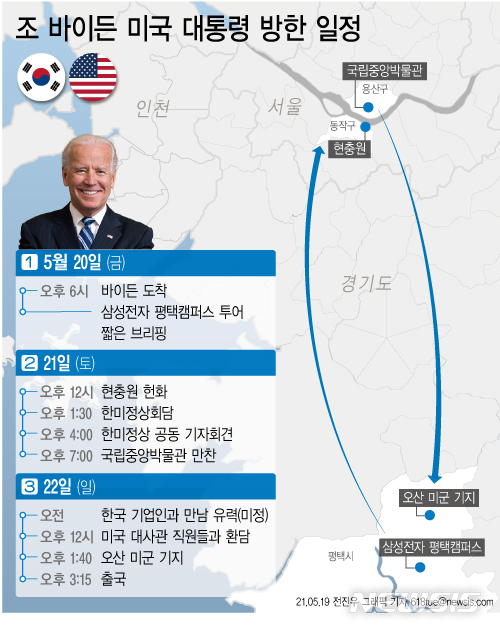 21일 오전 일정은 서울 동작구에서 시작한다. 바이든 대통령은 국립서울현충원을 방문해 현충탑에서 헌화하고 참배할 예정이다.