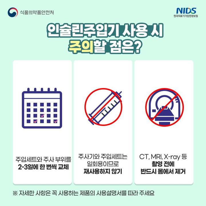 또 사용 전 반드시 주입 부위와 손을 깨끗하게 소독하고 주입 세트의 손상 여부를 확인한 다음 인슐린주입기와 올바르게 연결한다. 인슐린주입기의 인슐린 잔량과 주입량, 배터리 상태도 확인한다.