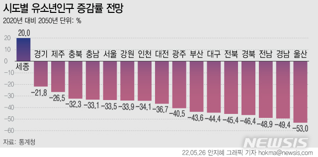 2020년 기준 시도별 유소년인구 비중은 세종이 19.9%로 가장 높고 서울이 10.3%로 가장 낮았다. 2050년 유소년인구 비중은 세종(13.2%)과 제주(10.1%)만 10%대를 유지했으며 나머지 15개 시도는 10% 미만으로 낮아질 것으로 보인다.