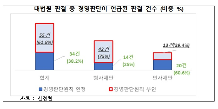전국경제인연합회가 최준선 성균관대 법학전문대학원 명예교수에 의뢰해 2011~2021년 경영판단원칙을 다룬 대법원 판결을 분석한 결과, 경영판단원칙을 다룬 대법원 판례는 지난 10년간 총 89건으로, 이 중 38.2%(34건) 만 경영판단의 원칙을 인정 받았다.