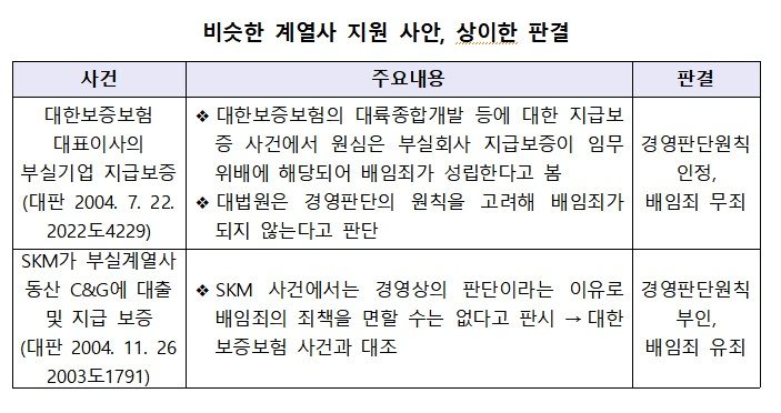 최 교수는 "그룹내 부실 계열사에 대한 지급 보증이 배임죄로 문제가 될 경우, 법원은 경영판단원칙을 인용해 무죄로 판결하기도 하고 회사에 손해를 끼칠 위험이 있다는 이유로 경영판단원칙을 부인하기도 했다"면서 "결국 기업들은 배임죄 처벌 위험과 법원의 비일관된 경영판단원칙 적용으로 이중고를 겪는 상황"이라고 밝혔다.