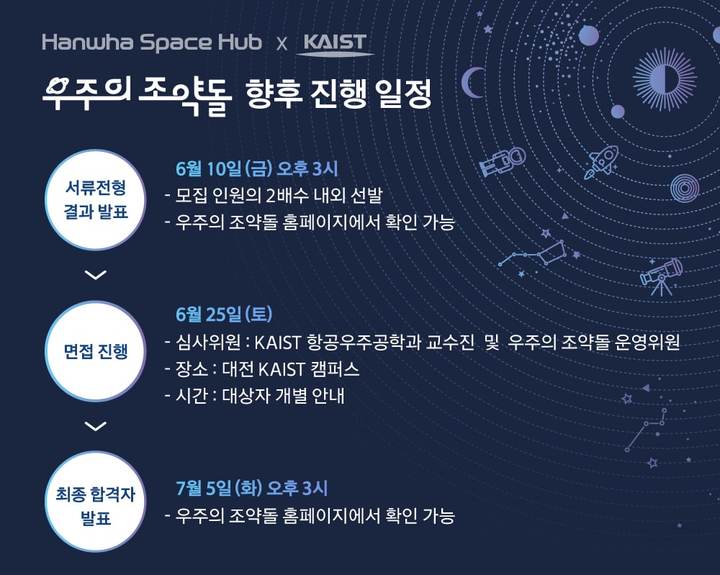 에세이 심사(1차 전형) 결과는 오는 10일 발표된다. 이어지는 면접 심사(2차 전형)까지 통과한 학생 30명이 ‘우주의 조약돌 1기’로 최종 선발된다.