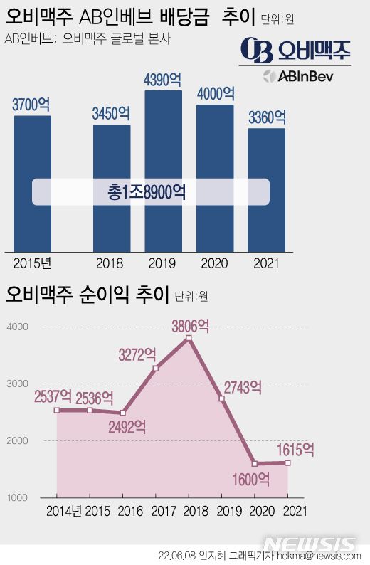오비맥주는 2015년 3700억원, 2018년 3450억원, 2019년 4390억원, 2020년 4000억원, 2021년 3360억원을 각각 배당금으로 AB인베브에 송금한 것으로 드러났다.