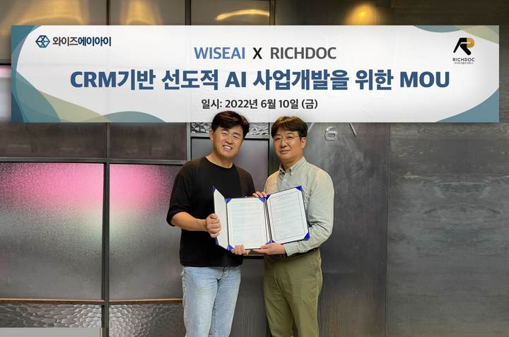 [서울=뉴시스] 김경택 기자 = K-OTC 상장 인공지능(AI) 의료통합지원 솔루션 전문기업 와이즈에이아이는 병원경영지원(MSO) 전문기업 '리치닥(RICHDOC)'과 AI 솔루션 기반 고객관계관리(CRM) 시스템 개발 사업 협력을 위한 전략적 업무협약(MOU)을 체결했다고 13일 밝혔다.