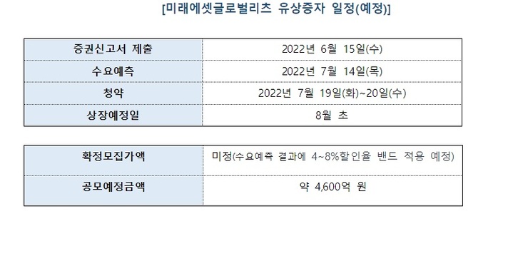 총 공모금액은 4600억원으로, 수요예측은 다음달 14일에 진행하며 결과에 따라 4~8% 할인율 밴드를 적용한 뒤 확정할 예정이다. 이달 19~20일 청약을 거쳐 다음달 초 신주 상장을 추진한다. 대표 주관사는 미래에셋증권과 NH투자증권이 공동으로 맡았으며 인수단은 신한금융투자와 DB금융투자다.
